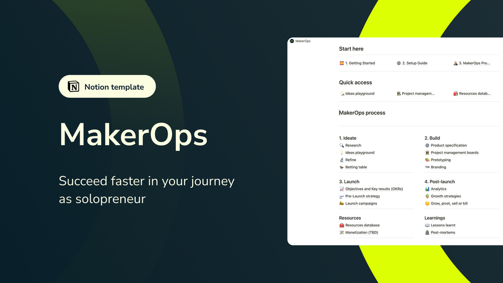 MakerOps is the Notion template that helps you succeed faster in your solopreneur journey by allowing you to transform raw ideas into digital products as fast as possible.